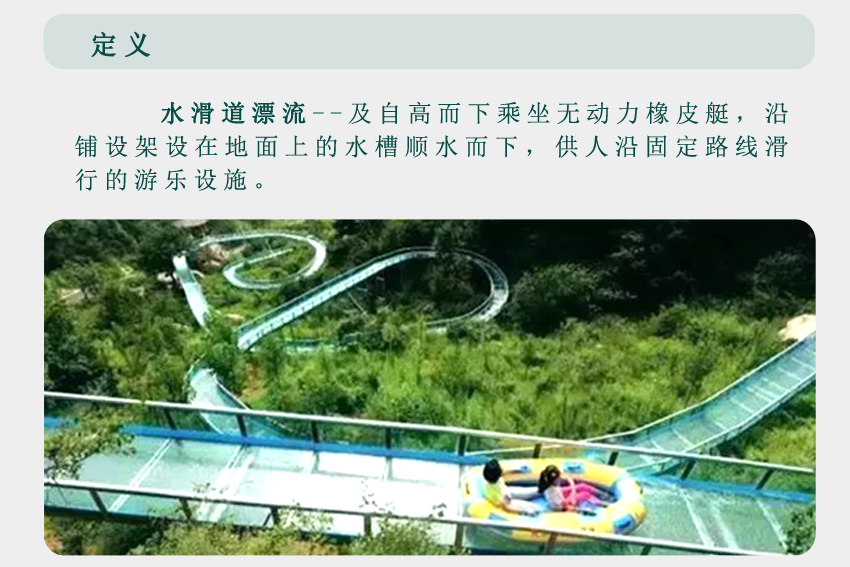 一是,依據大型生態漂流的體驗感,設計優化升級而來。依地勢修建漂流槽,槽內水深約20公分,水在漂流槽中托船順流而下,速度可控,刺激與安全兼得,確保百分之三百的安全。在設計上我們可以做到游客在漂流過程中基本不濕衣物。我們暫且稱這種形式的漂流為水滑道漂流。